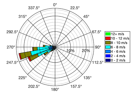 The WHOTS Ocean Reference Station (ORS) is located north of the Hawaiian Island of Oahu. Instruments on the surface buoy record surface meteorology. Based on observations from 2004 to 2022, this wind rose provides a pictorial summary of the winds, summarizing wind direction and wind speed as a radial histogram. Direction is the direction the wind blows towards, so the wind rose is dominated by the East-Northeast trade winds blowing towards the West-Southwest.