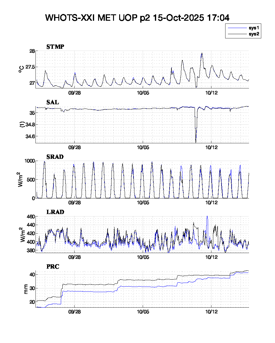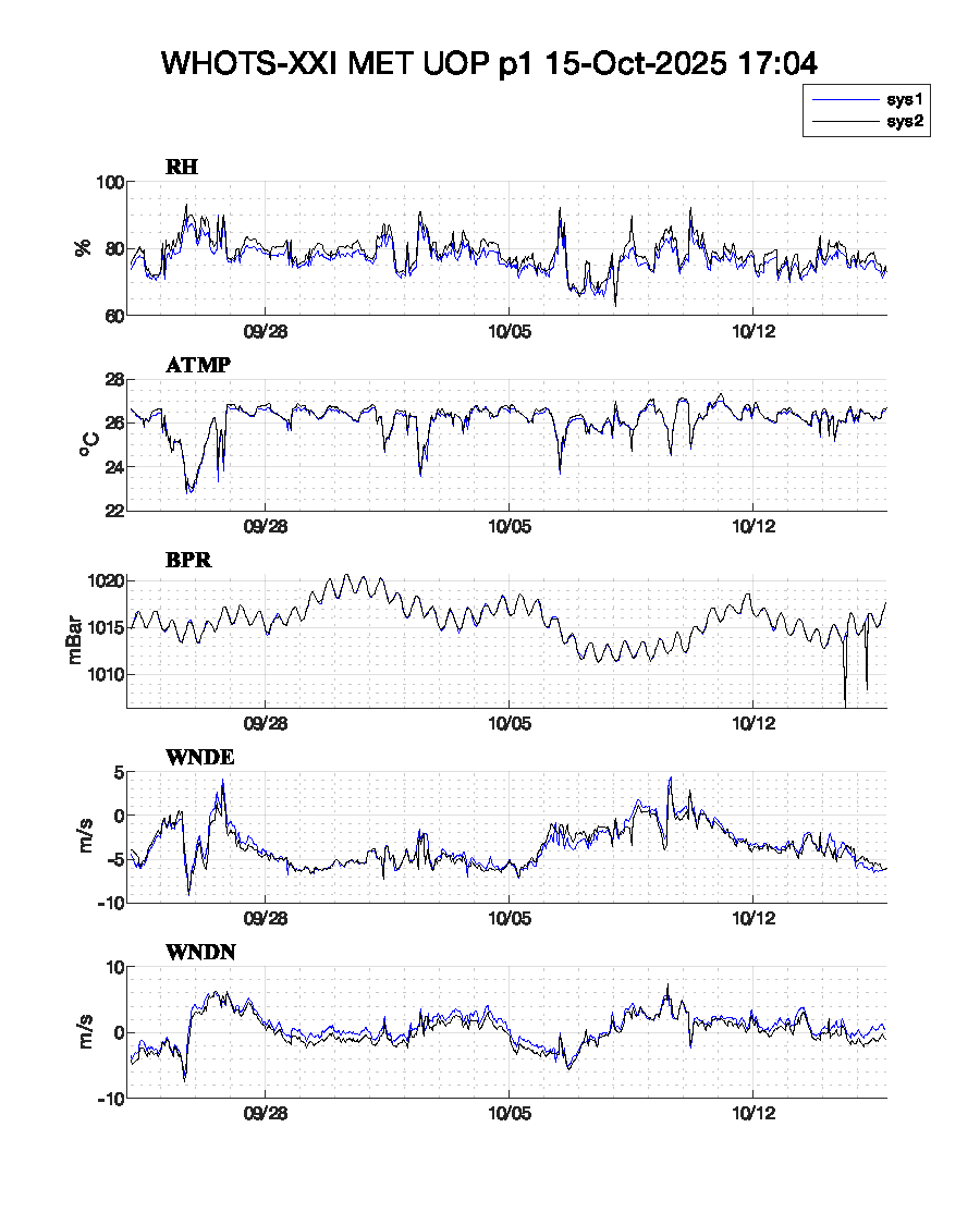 WHOTS-21 Deployed: September 24, 2025 at 00:53 UTC Met data text files: Daily transmission: Logger 5 Logger 42 Complete listing: Logger 5 Logger 42 Plots: plot-1 or plot-2 or plot-3 | |