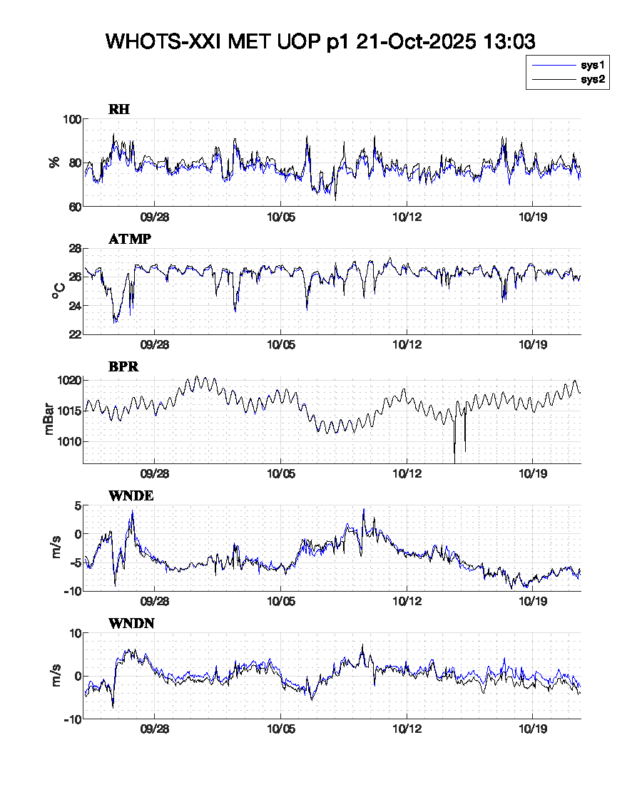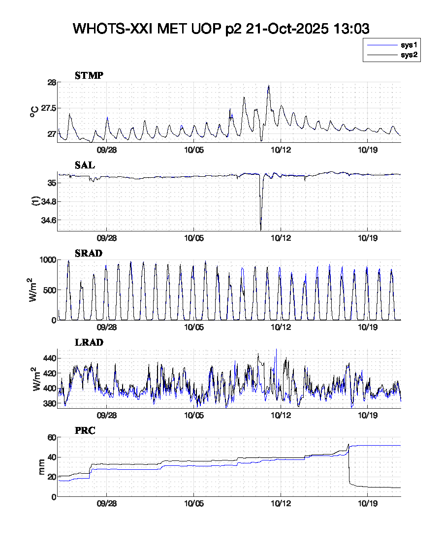 WHOTS-21 Deployed: September 24, 2025 at 00:53 UTC Met data text files: Daily transmission: Logger 5 Logger 42 Complete listing: Logger 5 Logger 42 Plots: plot-1 or plot-2 or plot-3 | |